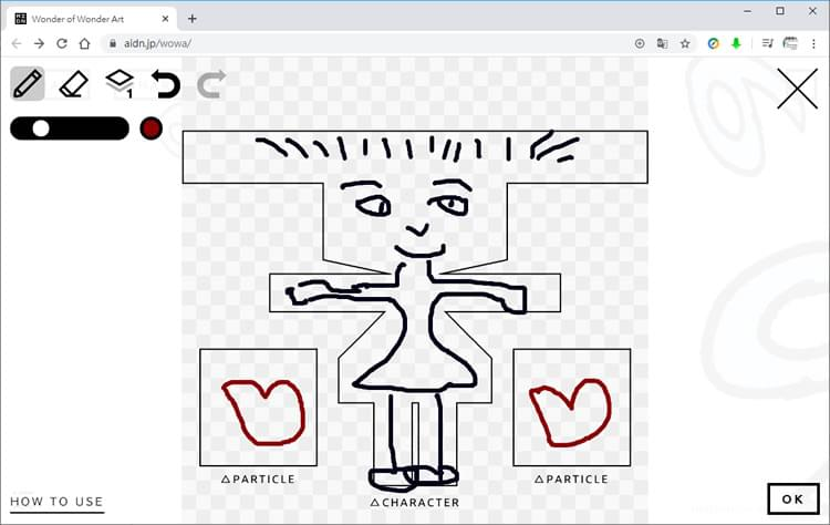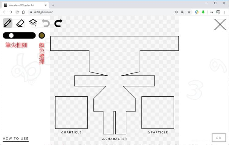 3、通过左侧的画笔工具,在其给出的范围绘制出人物,PARTICLE 就是随机出现的物件,完成绘制,点击[ OK ]。