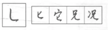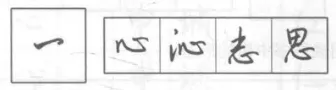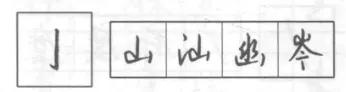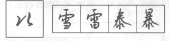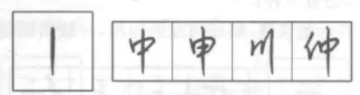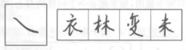 与正楷写法相似,形同匕首,常与竖钩相连,写成竖钩提一笔。